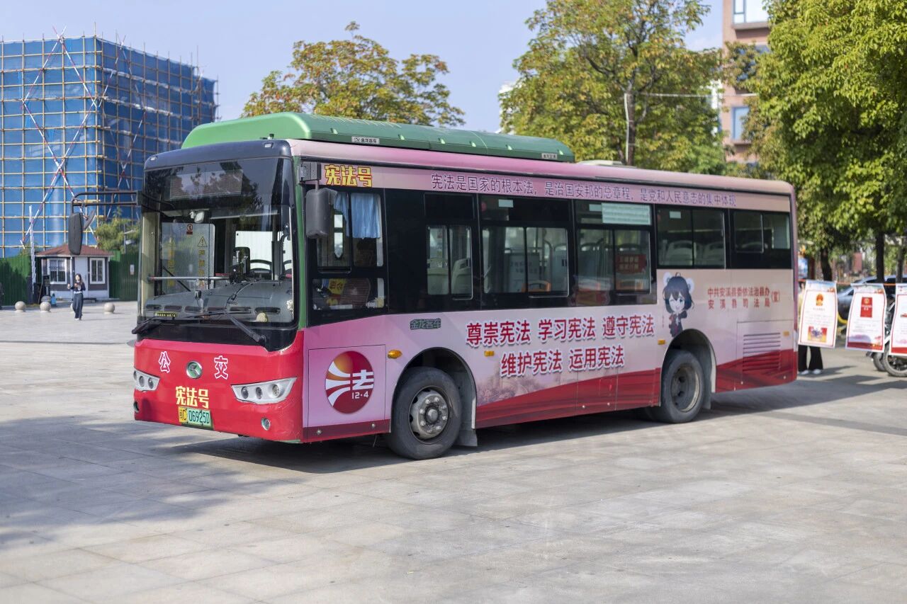 活動現場,裝飾著法治標語與憲法元素的“憲法號”公交車作為流動普法載體打造“移動宣傳臺”,讓法治宣傳融入群眾日常出行。